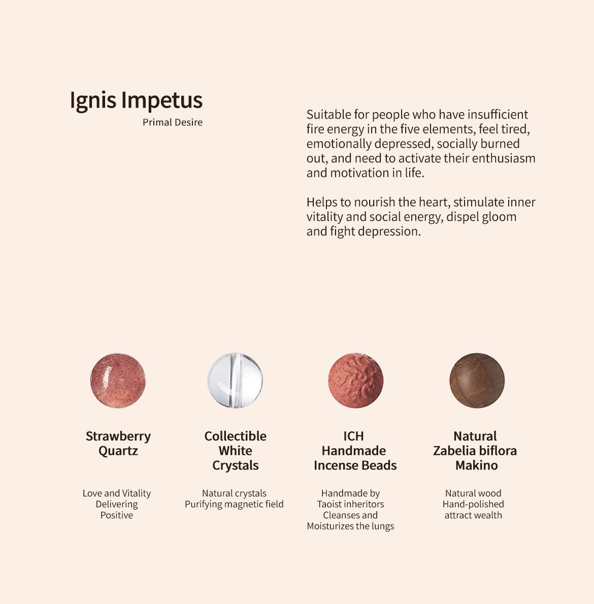 Suitable for people who have insufficient fire energy in the five elements, feel tired, emotionally depressed, socially burned out, and need to activate their enthusiasm and motivation in life.