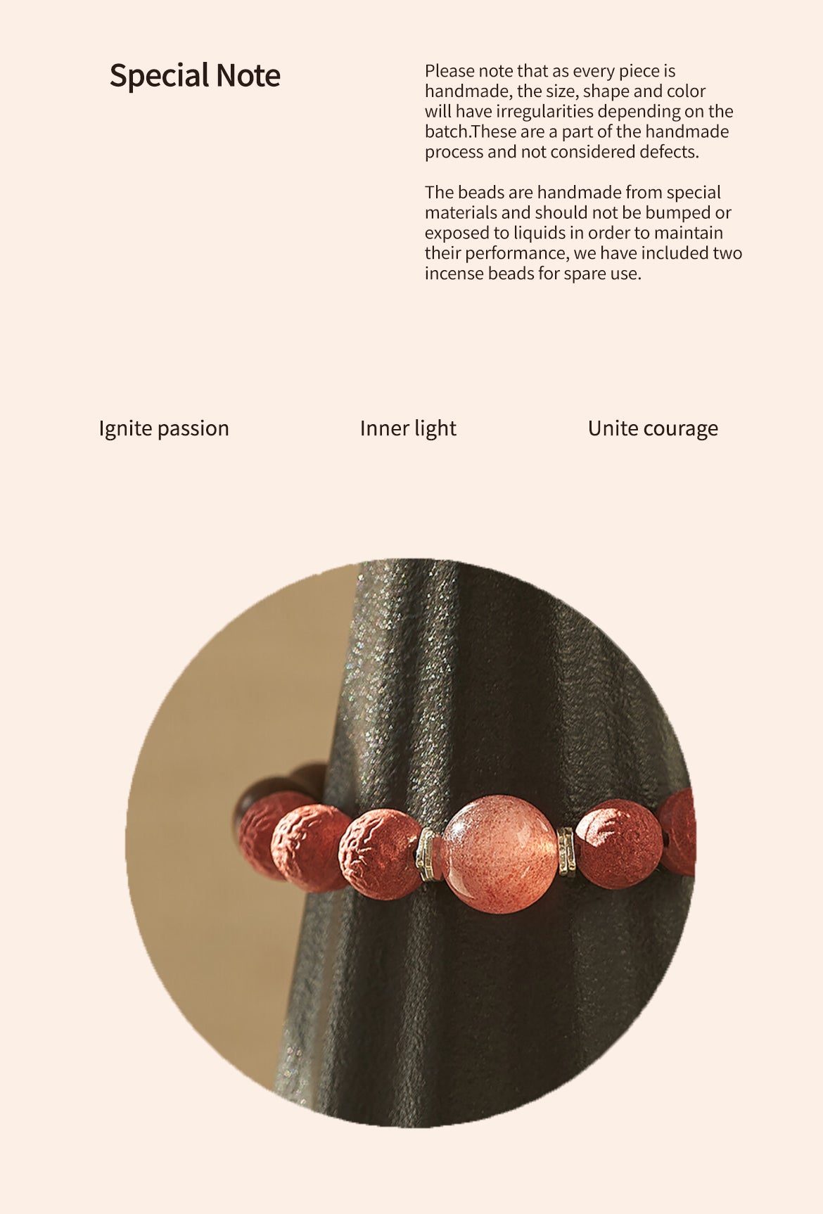 The beads are handmade from special materials and should not be bumped or exposed to liquids in order to maintain their performance, we have included two incense beads for spare use.