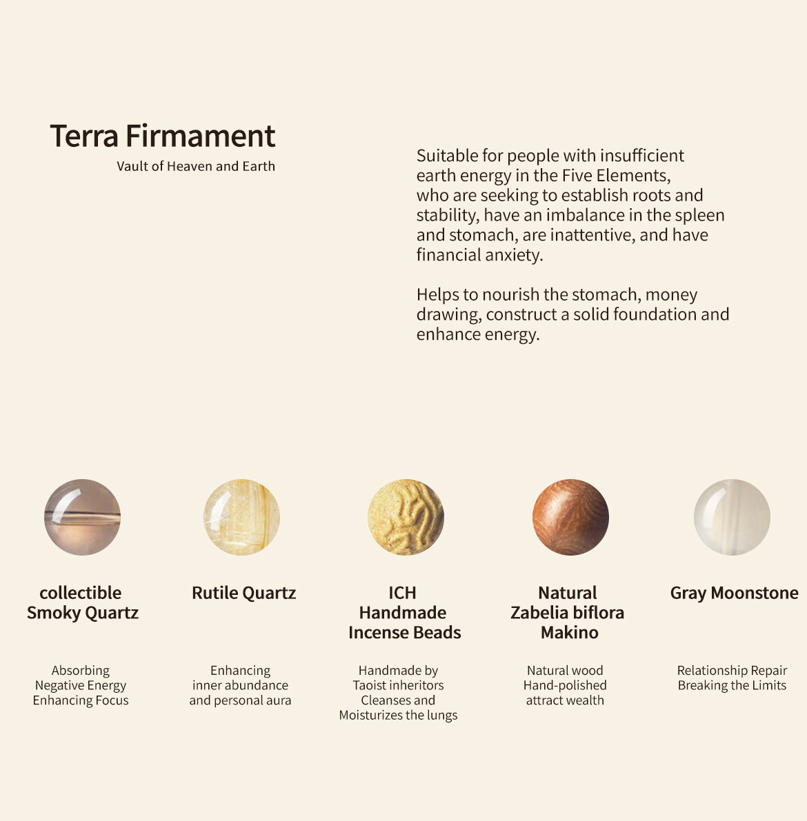 Suitable for people with insufficient earth energy in the Five Elements, who are seeking to establish roots and stability, have an imbalance in the spleen and stomach, are inattentive, and have financial anxiety.